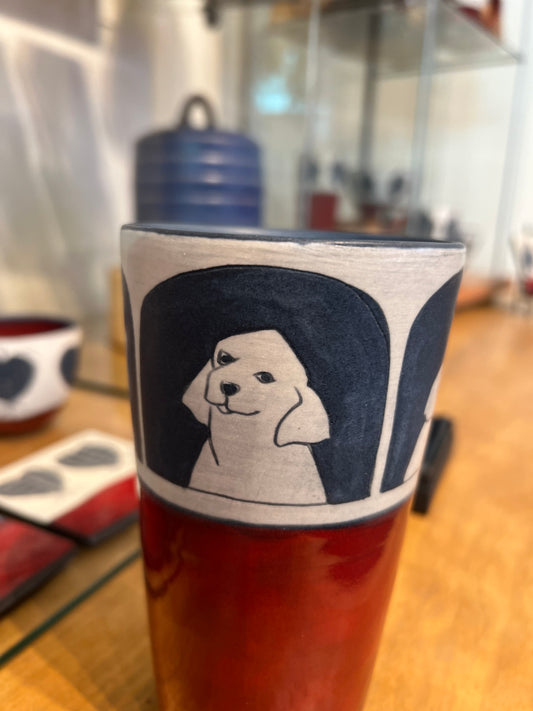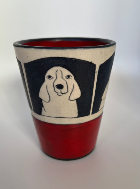 Dogs on Juice cup 3.5"x3" by Sally Jaffee